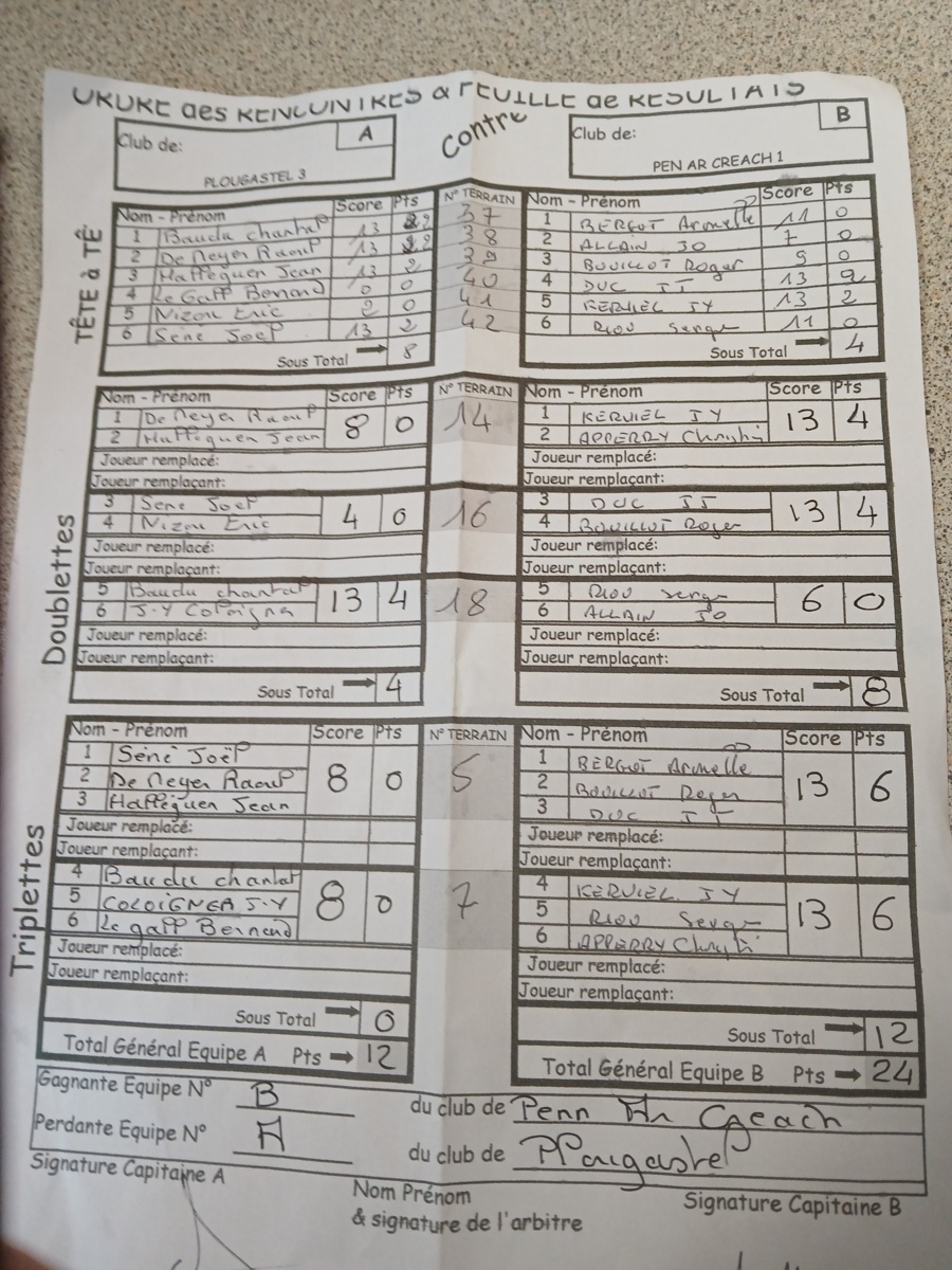 L'équipe de Pen Ar Créac'h composée d'Armelle Bergot, Christian Apperry, Jo Allain, Serge Riou, Jean-Jacques Duc, Roger Bouillot et Jean-Yves Kerviel ont remporté une belle victoire 24 à 12 devant l'équipe de Plougastel 3 sur les terrains de Ploudalmézeau.